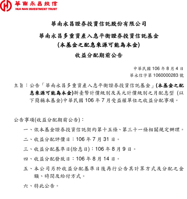 華南永昌多重資產入息平衡基金(本基金之配息來源可能為本金)新臺幣計價及美元計價之月配息型106年7月份收益分配期前公告
