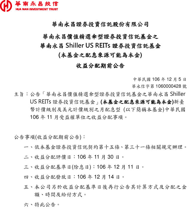 華南永昌價值精選傘型基金之華南永昌Shiller US REITs 基金(本基金之配息來源可能為本金)新臺幣計價級別及美元計價級別之月配息型106年11月受益權單位之收益分配期前公告